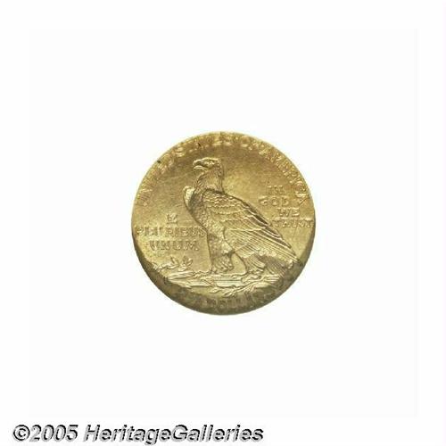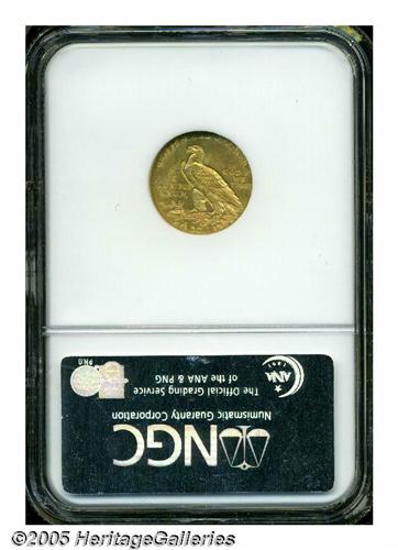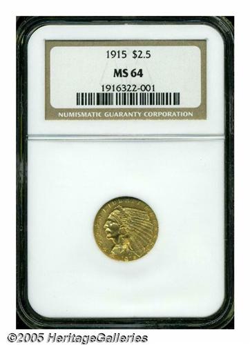 <B>1915<$2 1/2> MS64 NGC.</B></I> Shimmering luster bathes the smooth olive-gold and apricot surfaces. The strike is crisp, although the lowest headdress feathers do not have complete detail, as is the rule for the series. One small mark on the U in TRUST is distant from the focal points. A beautiful Choice example of the popular type, which unlike the other gold series is readily collectible by date and mintmark.