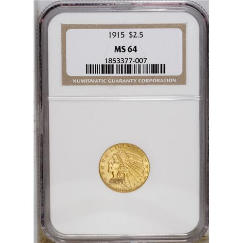 <B>1915 $2 1/2 MS64 NGC.</B></I> Soft luster adheres to peach-gold surfaces, and the design elements are well brought up. A greenish speck is noted at the top of the last A in AMERICA.<BR><BR><b>Shipping:</b> Coin/Currency (<a target="_blank" href="http://www.heritageauctions.com/common/shipping.php">view shipping information</a>)