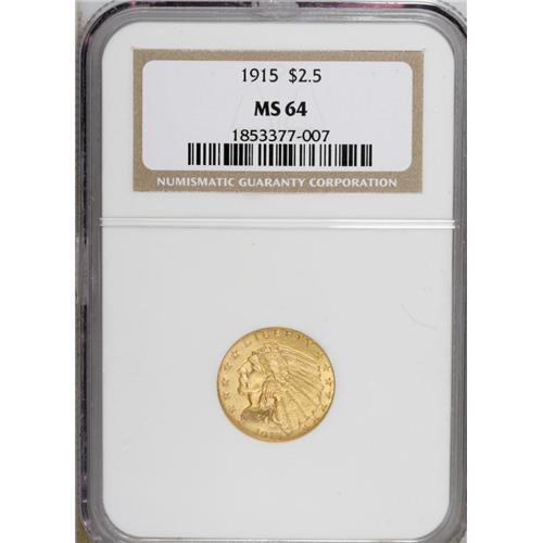<B>1915 $2 1/2 MS64 NGC.</B></I> Soft luster graces the peach-gold surfaces, and the design elements are well brought up. A small green speck is noted at the top of the second A in AMERICA. A great representative of this available issue.<BR><BR><b>Shipping:</b> Coins & Currency (<a target="_blank" href="http://www.heritageauctions.com/common/shipping.php">view shipping information</a>)