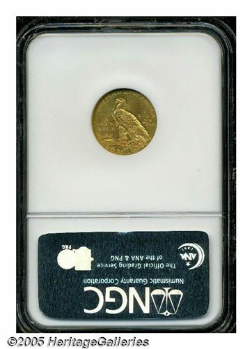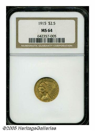 <B>1915<$2 1/2> MS64 NGC.</B></I> The 1915 quarter eagle becomes somewhat scarcer in MS64, and considerably more difficult beyond that. The surfaces are honey-gold, and display soft luster and adequately struck design elements. A few light handling marks are noted in the upper reverse field, but are not in the least bothersome.