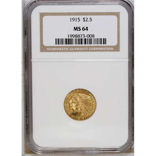 <B>1915 $2 1/2 MS64 NGC.</B></I> This near-Gem exhibits attractive green-gold and pink coloration with bright, satiny textured surfaces. Only a couple of small milling marks, and several faint pinscratches on the reverse prevent a higher grade.<BR><BR><b>Shipping:</b> Coin/Currency (<a target="_blank" href="http://www.heritageauctions.com/common/shipping.php">view shipping information</a>)