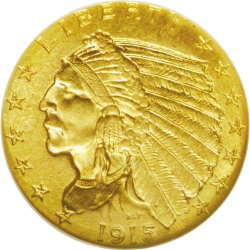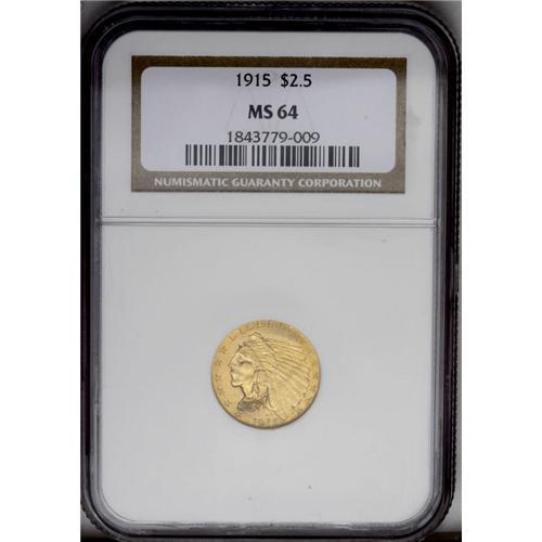 <B>1915<$2 1/2> MS64 NGC.</B></I> Vivid reddish peach-gold toning ensures a high degree of eye appeal for this lustrous near-Gem. The only surface marks, in the upper reverse fields, are too minute to be seen without a magnifier. A nice coin and worthy of a strong bid.