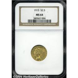 <B>1915<$2 1/2> MS64 NGC.</B></I> Both sides are toned a straw gold, covering somewhat muted luster. The design elements are nicely struck throughout, and just a couple of trivial marks are noted on the Indian's cheekbone and eyebrow. <BR><BR><B>Important notice:</B> Heritage usually auctions material at the rate of 200-250 lots per hour. On some occasions eBay Live bid software or the Internet may not be able to keep up with the pace of the auction. We recommend placing a realistic absentee bid now as insurance to avoid disappointment. Occasionally the auctioneer may eliminate or reject an eBay Live bid, and the auctioneer may also reopen a lot after the close of the eBay live bidding (usually because we missed an audience bid), and may reject your bid even if it shows you as the winning bidder. By bidding via eBay Live, you agree that Heritage may award the lot to another bidder at its sole discretion under the circumstances described above or any other reasonable circumstances. Since eBay bids are not shown to us until we open the lot on the floor, we treat those bids just like floor bids. In most cases the floor responds before the eBay bid is presented to us, due to Internet lag time, so for consistency we have made it a policy that floor bids are always considered first over tie eBay live bids. Also please note that all Heritage lots purchased through eBay Live carry a 20% Buyer's Premium. Please make sure you read the Terms and Conditions before you bid. </span></font></tr></table></td></tr></table>