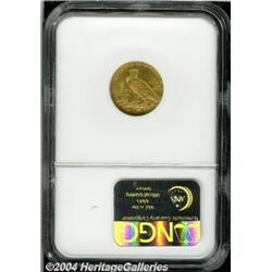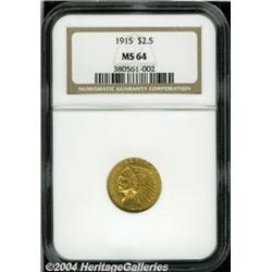 <B>1915<$2 1/2> MS64 NGC.</B></I> Honey-gold luster with greenish undertones visits both obverse and reverse. Nicely struck, with just a couple of trivial marks on the Indian's face. <BR><BR><B>Important notice:</B> Heritage usually auctions material at the rate of 200-250 lots per hour. On some occasions eBay Live bid software or the Internet may not be able to keep up with the pace of the auction. We recommend placing a realistic absentee bid now as insurance to avoid disappointment. Occasionally the auctioneer may eliminate or reject an eBay Live bid, and the auctioneer may also reopen a lot after the close of the eBay live bidding (usually because we missed an audience bid), and may reject your bid even if it shows you as the winning bidder. By bidding via eBay Live, you agree that Heritage may award the lot to another bidder at its sole discretion under the circumstances described above or any other reasonable circumstances. Since eBay bids are not shown to us until we open the lot on the floor, we treat those bids just like floor bids. In most cases the floor responds before the eBay bid is presented to us, due to Internet lag time, so for consistency we have made it a policy that floor bids are always considered first over tie eBay live bids. Also please note that all Heritage lots purchased through eBay Live carry a 20% Buyer's Premium. Please make sure you read the Terms and Conditions before you bid. </span></font></tr></table></td></tr></table>