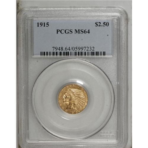 <B>1915 $2 1/2 MS64 PCGS.</B></I> A light gold colored coin with good luster. Both obverse and reverse is sharply struck with minimum markings. The profile of the Indian is especially bold and stands out accordingly.<BR><BR><b>Shipping:</b> Coin/Currency (<a target="_blank" href="http://www.heritageauctions.com/common/shipping.php">view shipping information</a>)