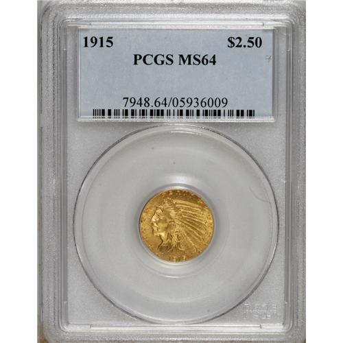 <B>1915 $2 1/2 MS64 PCGS.</B></I> A lovely near-Gem example of this pre-war issue, one that would prove to be the last for a decade. The peach-gold surfaces have pleasing luster, and the well struck devices exhibit small hints of yellow and orange color.<BR><BR><b>Shipping:</b> Coins & Currency (<a target="_blank" href="http://www.heritageauctions.com/common/shipping.php">view shipping information</a>)