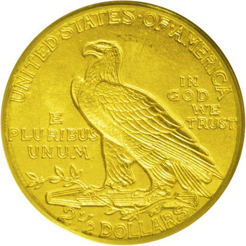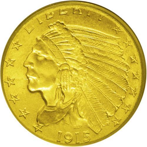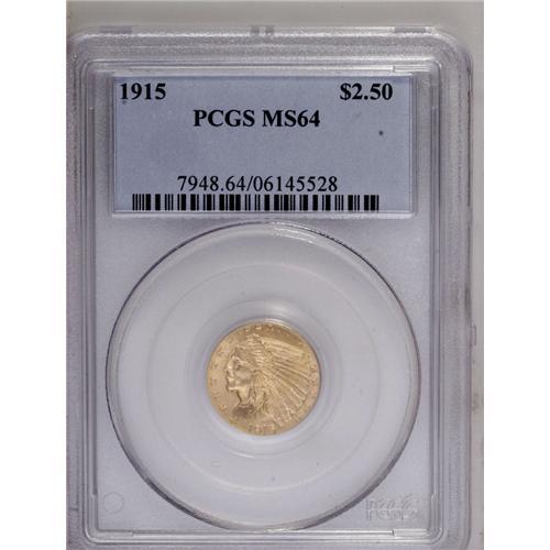 <B>1915<$2 1/2> MS64 PCGS.</B></I> Although this issue had the third-highest mintage of the series, the Indian Head design was roundly condemned when issued, and few collectors were interested in saving examples. This is a well executed copper-gold specimen with some smoky patches, showing a few light abrasions on the cheek and in the left obverse field that are consistent with the near-Gem grade. The reverse shows minimal marks as well, in the form of a tiny luster graze and a couple of pinscratches above the eagle's head. Crisply struck and appealing! PCGS has graded 78 finer (6/06).