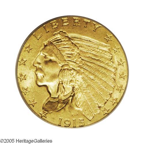 <B>1915<$2 1/2> MS64 PCGS.</B></I> Bright mustard-gold color dominates each side of this Quarter Eagle, being a shade deeper on the reverse. The design elements are nicely struck throughout. A scattering of noticeable light abrasions is seen in the right reverse field.