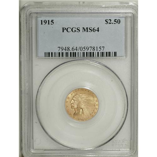 1915 $2 1/2 MS64 PCGS. Soft, pleasing luster is the ru