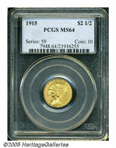 <B>1915<$2 1/2> MS64 PCGS.</B></I> The 1915 quarter eagle is not particularly difficult to locate in grades up through MS63, but MS64 examples are not available all that often. This near-Gem specimen has soft luster and honey-gold patina, and exhibits very nice strike detail. A few grade-limiting marks are seen on the Indian's cheek and in the upper right (facing) reverse field.