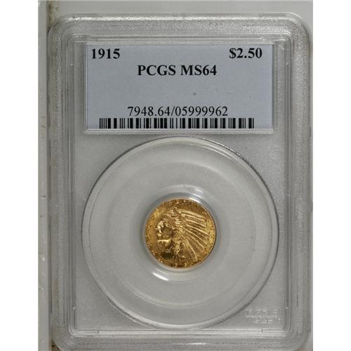 <B>1915 $2 1/2 MS64 PCGS.</B></I> The yellow-gold surfaces have hints of pale green and lavender in the deeper recesses. A strongly struck piece that has no singularly mentionable marks.<BR><BR><b>Shipping:</b> Coin/Currency (<a target="_blank" href="http://www.heritageauctions.com/common/shipping.php">view shipping information</a>)