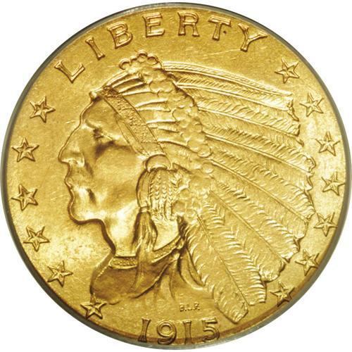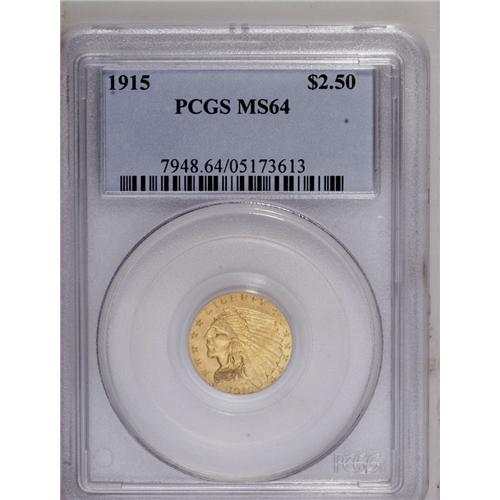 <B>1915<$2 1/2> MS64 PCGS.</B></I> This boldly struck apricot-gold near-Gem is refreshingly clean for the grade, aside from a pair of nearly imperceptible hairlines near the profile. The Philadelphia Mint struck quarter eagles every year between 1829 and 1915, but since the denomination was no longer used in commerce, eleven years passed until the next production in 1926.