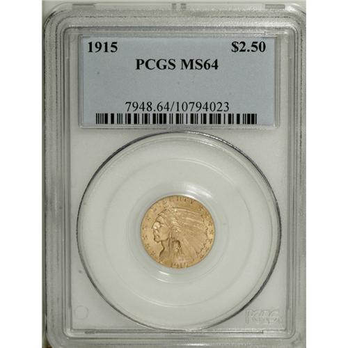 <B>1915 $2 1/2 MS64 PCGS.</B></I> This well struck near-Gem has satiny luster and excellent eye appeal. Tiny ticks are noted on the portrait, and a lone abrasion projects from the L in LIBERTY.<BR><BR><b>Shipping:</b> Coins & Currency (<a target="_blank" href="http://www.heritageauctions.com/common/shipping.php">view shipping information</a>)