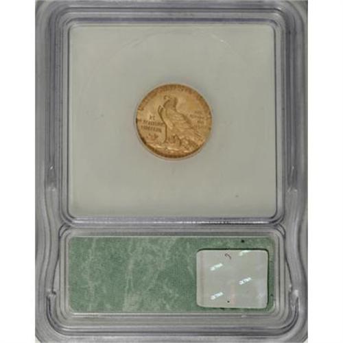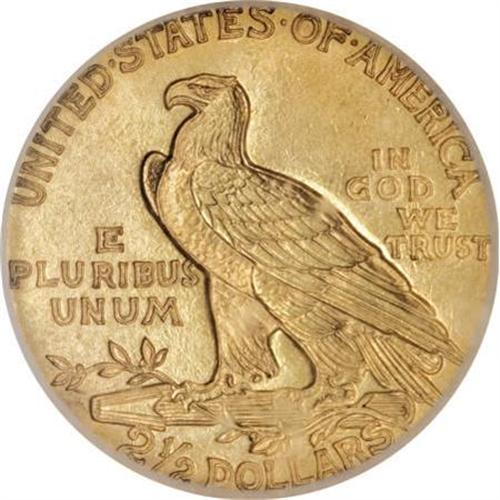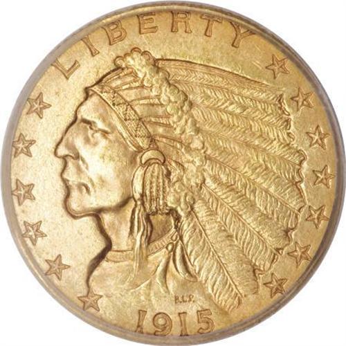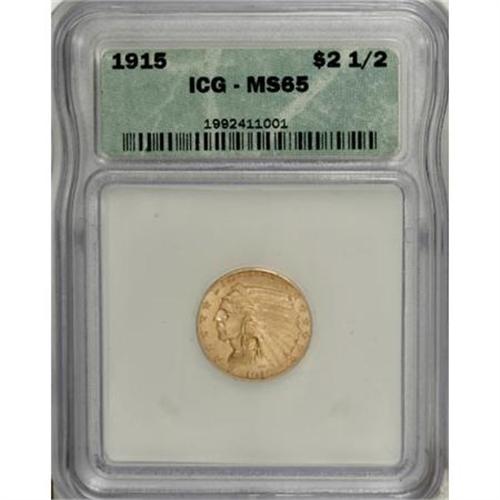<B>1915 $2 1/2 MS65 ICG.</B></I> The lustrous two-tone surfaces are khaki-gold and yellow-gold on the obverse, with a peach-gold accent on the reverse and a bit of light smoky haze noted on each side. Abrasions are relatively few, chiefly limited to a couple of pinscrapes in the left reverse field before the eagle's head and a couple of tiny ticks on the highpoint of the Indian's cheek. <BR><BR><B>Coin Engraver:</B> Bela Lyon Pratt<BR><BR><b>Shipping:</b> Coins & Currency (<a target="_blank" href="http://www.heritageauctions.com/common/shipping.php">view shipping information</a>\)