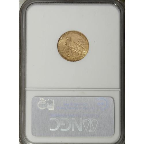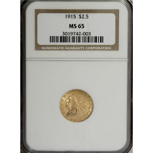 <B>1915 $2 1/2 MS65 NGC.</B></I> The 606,000 quarter eagles coined by Philadelphia in 1915 would be the last such coins produced for a decade. As with all Pratt quarter eagles, Gem representatives are elusive, and anything finer is prohibitively rare. This boldly impressed example has unusually lustrous yellow-orange surfaces that are clean, as demanded of the grade. NGC has awarded just one coin a higher grade (12/06).<BR><BR><b>Shipping:</b> Coin/Currency (<a target="_blank" href="http://www.heritageauctions.com/common/shipping.php">view shipping information</a>)