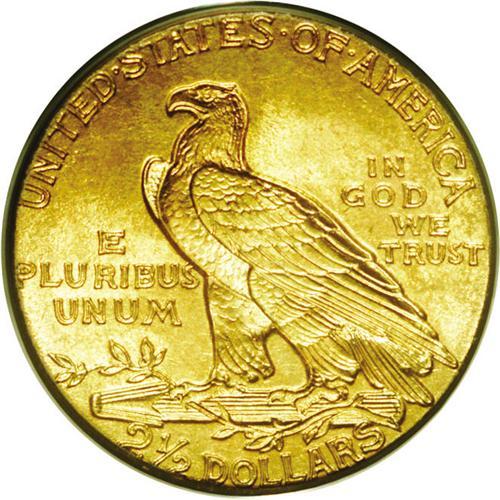 <B>1915<$2 1/2> MS65 PCGS.</B></I> This boldly impressed Gem displays full cartwheel luster, and offers uncommonly smooth surfaces. No marks are visible, even upon examination with a strong loupe. Carbon is not visible to the naked eye, and magnification only reveals a pinpoint speck near the inner point of star 1. The green-gold and apricot toning is clearly original. Although the 1925-D and 1926 are sometimes seen in the MS66 grade, the 1915 and other pre-war issues are generally uncollectible above MS65. The present piece is encapsulated in a green label holder, and approaches the finest quality available.