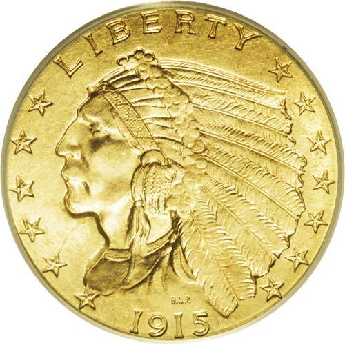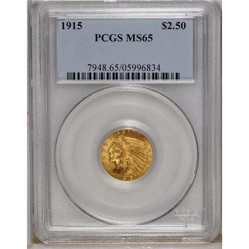 <B>1915 $2 1/2 MS65 PCGS.</B></I> This is one of the top mintages in the entire series of Indian quarter eagles, yet it is hard to find in Gem quality, requiring considerable patience. Only three dates in the entire series had a higher production than the 606,000 coins minted in 1915. A sharply struck example exhibiting rich honey-gold color and frosty luster on both sides. Population: 79 in 65, 3 finer (10/06).<BR><BR><b>Shipping:</b> Coin/Currency (<a target="_blank" href="http://www.heritageauctions.com/common/shipping.php">view shipping information</a>)