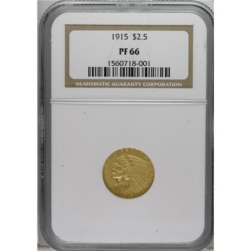 <B>1915 $2 1/2 PR66 NGC.</B></I> A course grained light matte finish characterizes this lovely Premium Gem proof. Both sides have brilliant lemon-yellow color, much lighter than the other 1915 proof quarter eagle offered in this sale. This issue represents the final regular issue gold proof of any denomination coined for collectors, although a few later gold commemoratives were produced in proof format. The production was limited to 100 pieces and the survival rate seems to be quite low with only about 30 to 40 examples remaining today. Census: 14 in 66, 5 finer (3/07).<BR><BR><b>Shipping:</b> Coins & Currency (<a target="_blank" href="http://www.heritageauctions.com/common/shipping.php">view shipping information</a>)