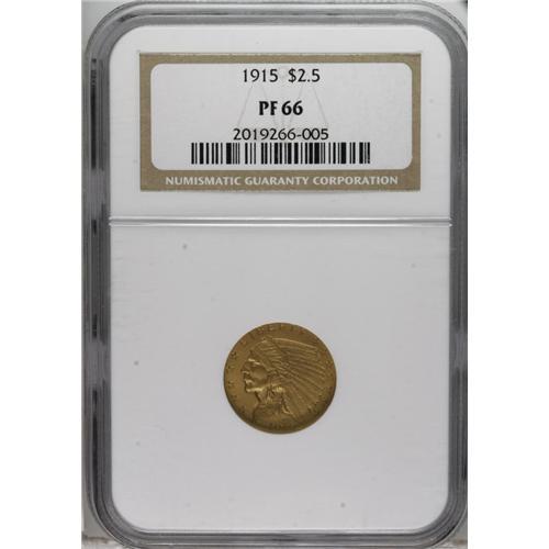 <B>1915 $2 1/2 PR66 NGC.</B></I> This Premium Gem proof has distinctive dark matte surfaces, darker than usually seen on this or any other matte proof quarter eagles. The best single color description for this piece seems to be ocher. Both sides have finely grained surface texture that is unusual for this date. A review of our archives indicates that there are two different types of finish for the matte proofs of this year. Another example in this sale has an entirely different appearance, and examples of both types have appeared in our past auctions.<BR><BR><b>Shipping:</b> Coins & Currency (<a target="_blank" href="http://www.heritageauctions.com/common/shipping.php">view shipping information</a>)