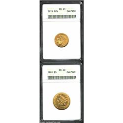 1915 $2 1/2 Quarter Eagle MS61 ANACS, the strike is bold in most areas, and the surfaces are lightly abraded with rich green-gold and orange-gold color; and a 1901 Half Eagle MS60 ANACS, sharply struck with faint, yet appreciably cartwheel effects. 2 coins Important notice: We expect to be auctioning lots at the rate of 200-250 per hour. Sometimes eBay Premier live bid software cannot keep up with that pace, so we strongly recommend that you place a realistic proxy bid now as insurance to avoid disappointment. Also please note that all Heritage/CAA lots purchased through eBay Premier carry a 20% Buyer's Premium. Please make sure you read the Terms and Conditions.