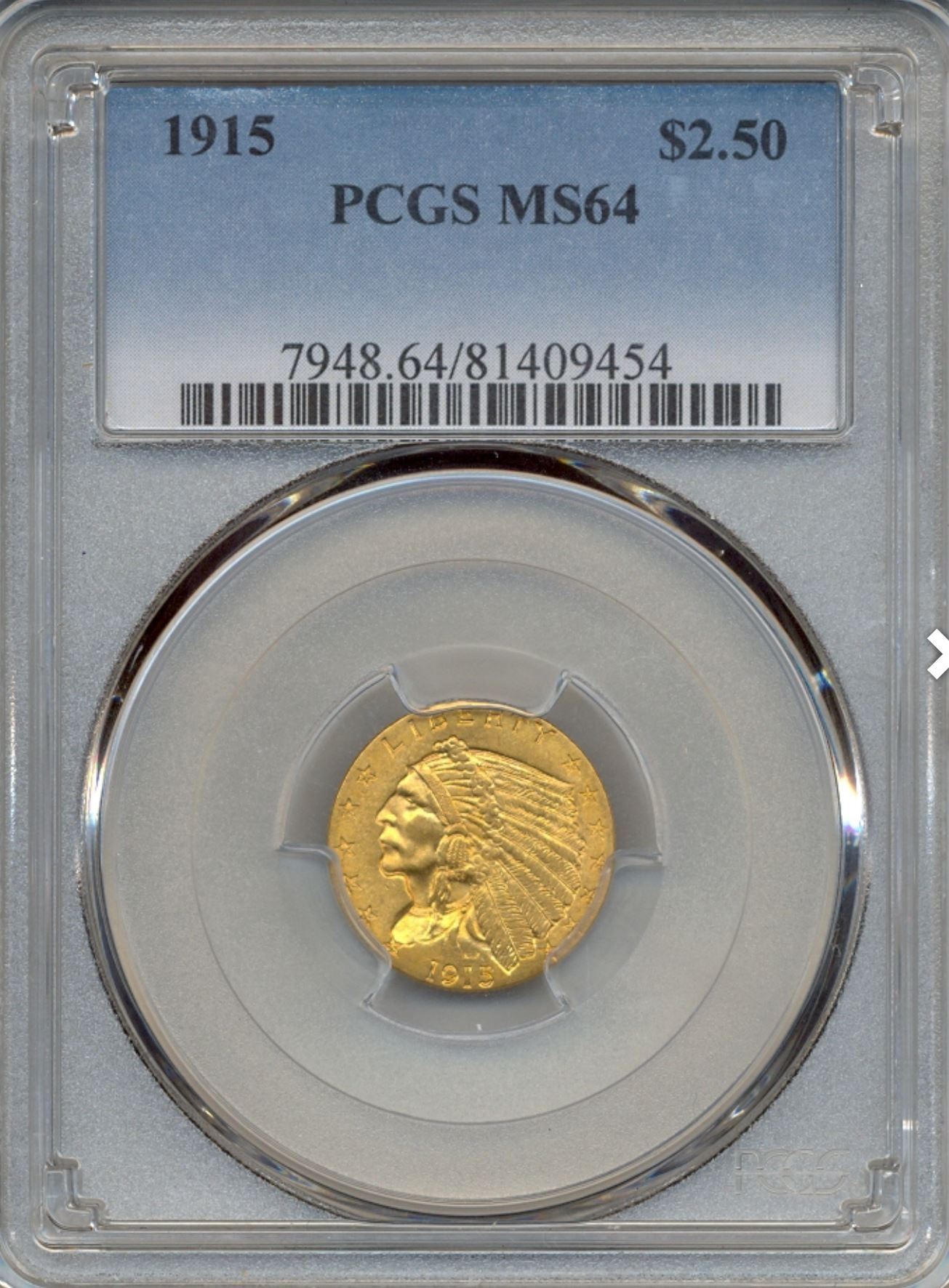 One 1915 $2.5 Indian Head Quarter Eagle Gold Coin NGC MS64.