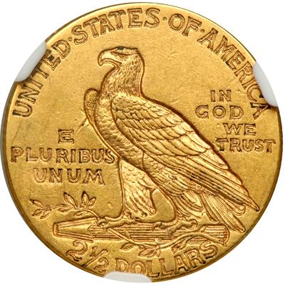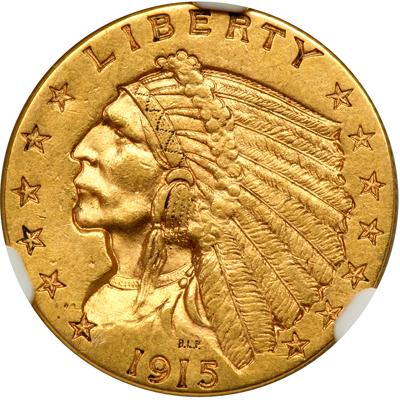 1915 $2.50 Indian. NGC graded AU-55. Toned. Sharp feather detail on the war bonnet (PCGS # 7948).
