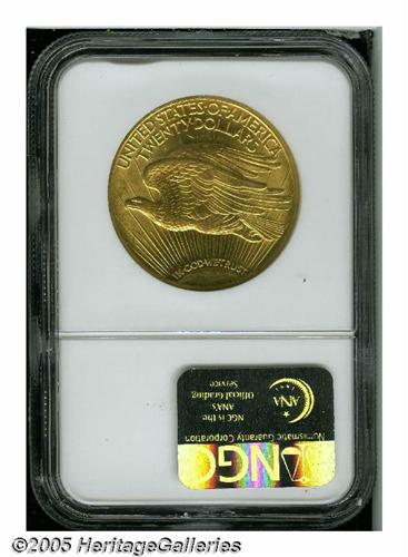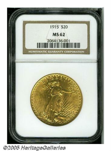 <B>1915<$20> MS62 NGC.</B></I> Bright yellow-gold surfaces reveal just a few minor obverse marks. The design features are well impressed.