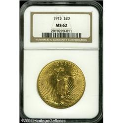 1915 $20 MS62 NGC. The bright surfaces assume a br <B>1915 $20 MS62 NGC.</B></I> The bright surfaces assume a brassy-gold color, and reveal several light abrasions. The design elements are well impressed. <BR><BR><B>Important notice:</B> Heritage usually auctions material at the rate of 200-250 lots per hour. On some occasions eBay Live bid software or the Internet may not be able to keep up with the pace of the auction. We recommend placing a realistic absentee bid now as insurance to avoid disappointment. Occasionally the auctioneer may eliminate or reject an eBay Live bid, and the auctioneer may also reopen a lot after the close of the eBay live bidding (usually because we missed an audience bid), and may reject your bid even if it shows you as the winning bidder. By bidding via eBay Live, you agree that Heritage may award the lot to another bidder at its sole discretion under the circumstances described above or any other reasonable circumstances. Since eBay bids are not shown to us until we open the lot on the floor, we treat those bids just like floor bids. In most cases the floor responds before the eBay bid is presented to us, due to Internet lag time, so for consistency we have made it a policy that floor bids are always considered first over tie eBay live bids. Also please note that all Heritage lots purchased through eBay Live carry a 20% Buyer's Premium. Please make sure you read the Terms and Conditions before you bid. This lot is being auctioned in conjunction with a live floor auction by Heritage Galleries & Auctioneers. All final auction and invoice information will be supplied by Heritage Galleries & Auctioneers, and all other information should be considered preliminary. Lot:7157