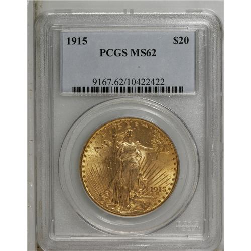 1915 $20 MS62 PCGS. The yellow-orange surfaces are min