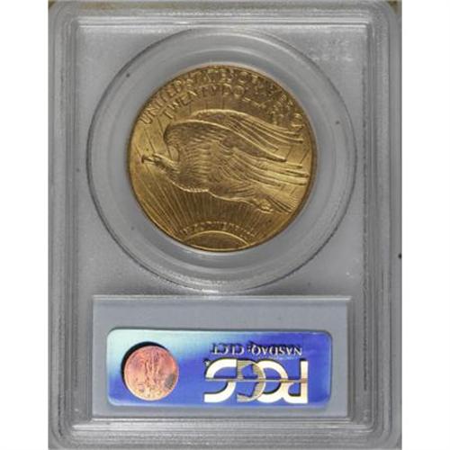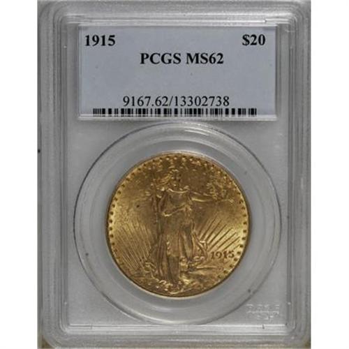 <B>1915 $20 MS62 PCGS.</B></I> Dusky yellow-gold surfaces show faint haze and a few small spots of alloy. A well struck example of this lower-mintage Saint-Gaudens twenty dollar issue, lightly abraded on each side.<BR><BR><B>Coin Engraver:</B> Augustus Saint-Gaudens<BR><BR><b>Shipping:</b> Coins & Currency (<a target="_blank" href="http://www.heritageauctions.com/common/shipping.php">view shipping information</a>)