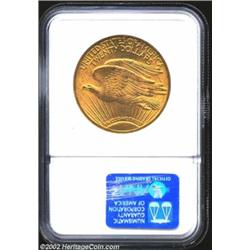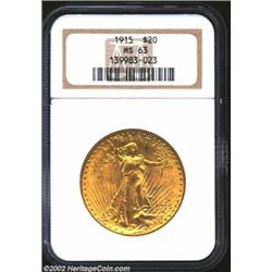 1915 $20 MS63 NGC. Mostly olive-gold in shade, both sides are moderately abraded with pleasingly bol