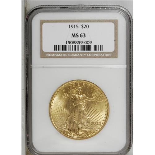 <B>1915 $20 MS63 NGC.</B></I> Sharply struck, with brassy-gold luster. Quite a pleasing specimen, that reveals fewer marks than what might be expected for the grade designation.<BR><BR><b>Shipping:</b> Coin/Currency (<a target="_blank" href="http://www.heritageauctions.com/common/shipping.php">view shipping information</a>)