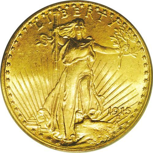 <B>1915<$20> MS63 PCGS.</B></I> A Select example of this scarcer P-mint from the teens. The surfaces are lightly abraded and show even golden-orange coloration and the usual matte-like texture.