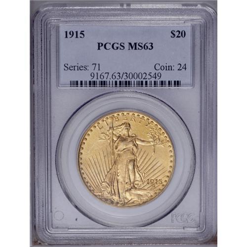 <B>1915<$20> MS63 PCGS.</B></I> Sharply struck with bright orange-gold color. A scarcer P-mint from this decade.