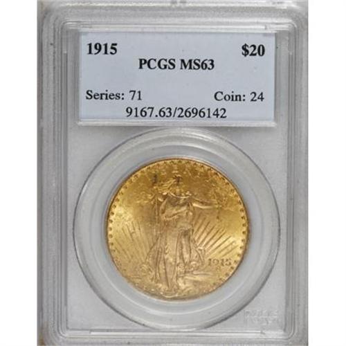 <B>1915 $20 MS63 PCGS.</B></I> A softly lustrous example of this interesting and low-mintage issue, one that is available in the lower Mint State grades but becomes highly elusive in Gem or better. This Select piece shows a number of light, scattered abrasions on its yellow-orange surfaces.<BR><BR><B>Coin Engraver:</B> Augustus Saint-Gaudens<BR><BR><b>Shipping:</b> Coins & Currency (<a target="_blank" href="http://www.heritageauctions.com/common/shipping.php">view shipping information</a>)