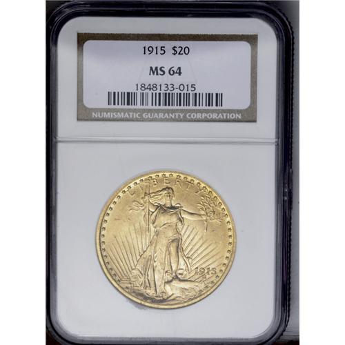 <B>1915<$20> MS64 NGC.</B></I> This sharply struck example displays dazzling khaki-gold luster, and the fields are refreshingly unblemished. The occasional tiny mark on the devices is usual for the MS64 level. Mintages of Philadelphia double eagles were limited between 1911 and 1915, and no further pieces would be struck at the facility until 1920.