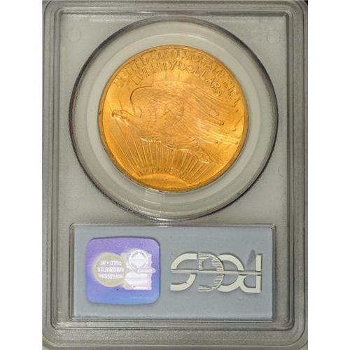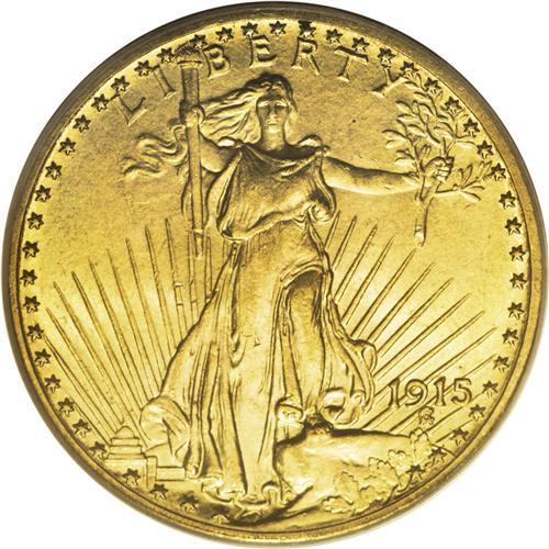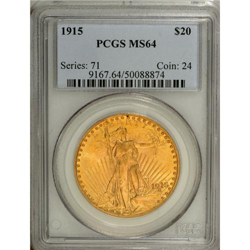 <B>1915 $20 MS64 PCGS.</B></I> A better date P-mint from the 1910s with an original mintage of only 152,050 pieces. This is a sharply struck example that has bright yellow-gold surfaces and soft, frosty luster. The fields are clean overall, though a handful of abrasions appear on the gown and the rays on the obverse<BR><BR><b>Shipping:</b> Coin/Currency (<a target="_blank" href="http://www.heritageauctions.com/common/shipping.php">view shipping information</a>)