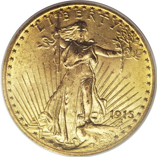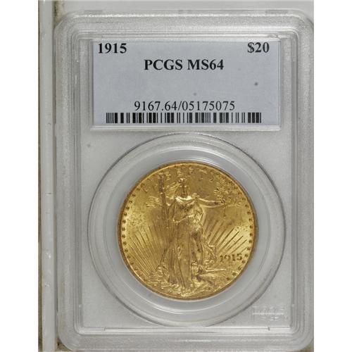 <B>1915 $20 MS64 PCGS.</B></I> A bold striking with characteristic satin surfaces enhanced by subtle olive and orange accents. This issue's comparatively low mintage of 152,050 explains its relative scarcity in average Uncirculated grades. The softness of gold as a metal and the likelihood that double eagles would spend time in rough long-term storage further accounts for how elusive this issue remains at higher Mint State levels.<BR><BR><b>Shipping:</b> Coins & Currency (<a target="_blank" href="http://www.heritageauctions.com/common/shipping.php">view shipping information</a>)