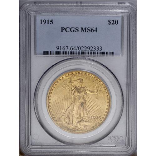 <B>1915 $20 MS64 PCGS.</B></I> A sharply defined example of this scarcer P-mint twenty. Rich golden-orange color is seen over each side of this matte-like, softly frosted coin.
