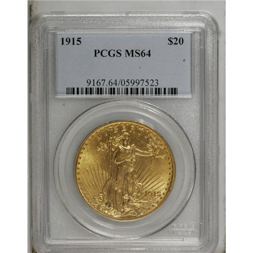 <B>1915 $20 MS64 PCGS.</B></I> A well struck, honey-yellow double eagle with plenty of luster that will appeal to a wide audience of collectors. The surfaces have a small number of abrasions in the lower portion of the reverse that affect the technical grade far more than the eye appeal of this desirable coin.<BR><BR><b>Shipping:</b> Coin/Currency (<a target="_blank" href="http://www.heritageauctions.com/common/shipping.php">view shipping information</a>)