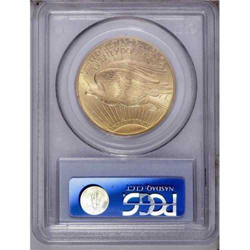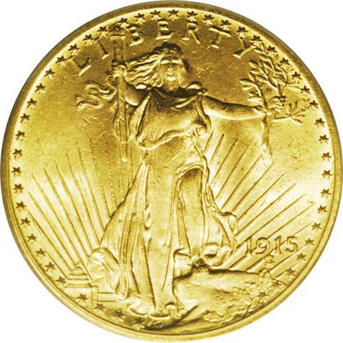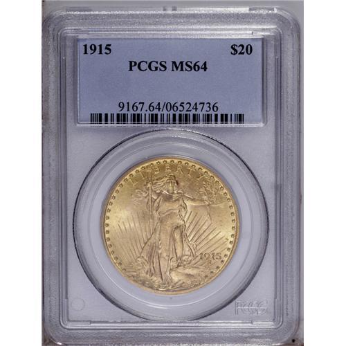 <B>1915<$20> MS64 PCGS.</B></I> Although most surviving 1915 double eagles grade AU or Mint State, few examples approach Gem quality. This is a smooth coin for even the MS64 grade whose surfaces seem to be denied a higher grade by the presence of scattered alloy spots on the obverse. A few minor marks are visible at select angles and the overall appearance is one of frosty, green-golden color. One of only 152,050 pieces struck.
