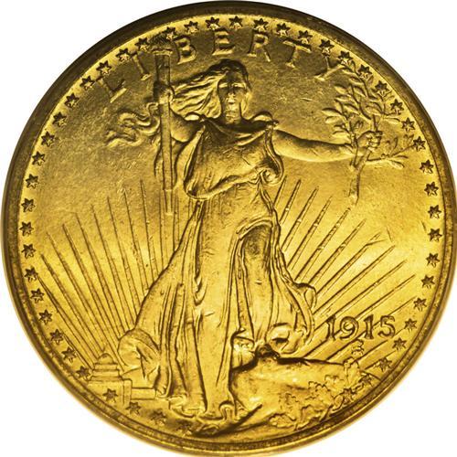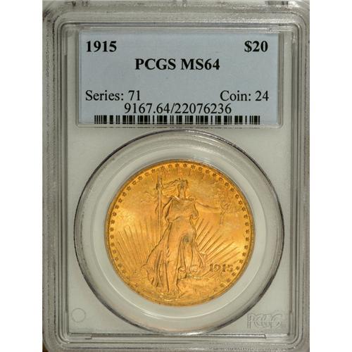 <B>1915 $20 MS64 PCGS.</B></I> An attractive example of this 48-star issue. The surfaces are predominantly yellow-gold but have traces of orange and emerald-green on each side. Though slight softness is noted on Liberty's torch hand, the strike is otherwise strong, and the luster is pleasing on this minimally abraded double eagle.<BR><BR><b>Shipping:</b> Coin/Currency (<a target="_blank" href="http://www.heritageauctions.com/common/shipping.php">view shipping information</a>)