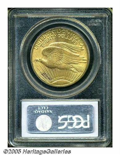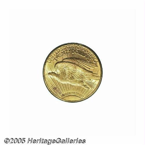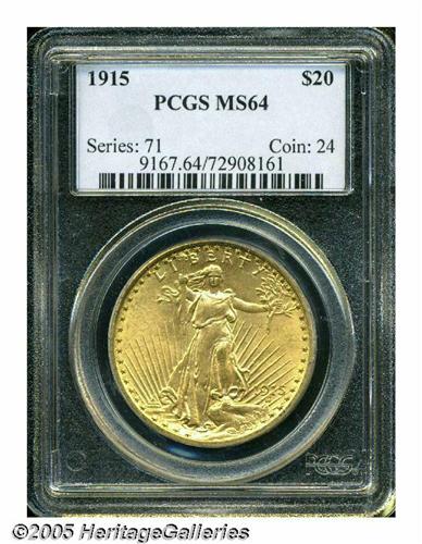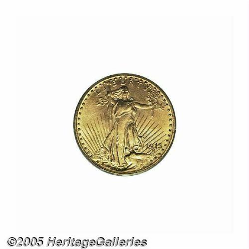 <B>1915<$20> MS64 PCGS.</B></I> The 1915 double eagle from Philadelphia is a scarce, lower mintage coin that is elusive in near-Gem. Just 152,050 examples were minted. The current coin is a respectable example of this date, with a sharp strike and ample luster to please the eye. The surfaces are very clean, have a peach-gold patina, and show minimal signs of handling, except for a couple of small contact marks on the eagle's wings. There are a couple of reverse streaks, one through the eagle's head, which will serve to identify this coin. PCGS has seen only 20 pieces finer (6/05).