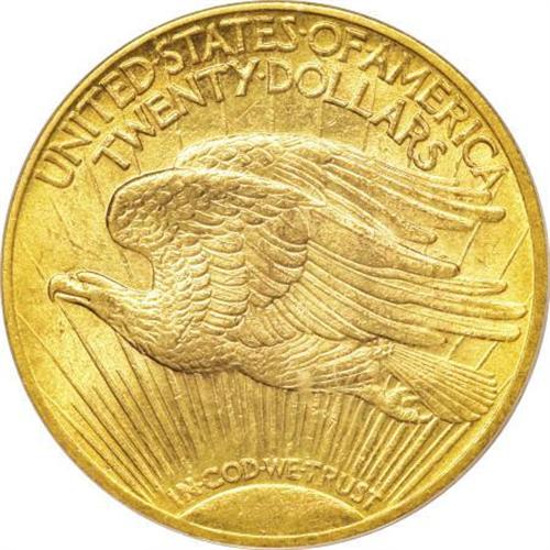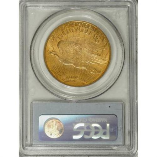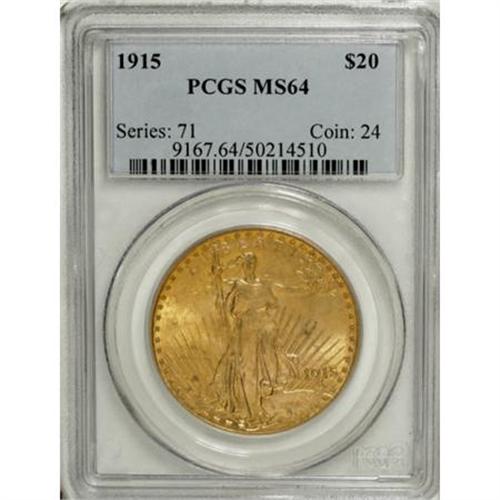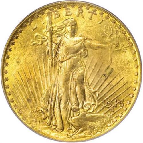 <B>1915 $20 MS64 PCGS.</B></I> This piece is extremely lustrous, with appealing lemon-yellow highlights. A couple of small dark toning spots between two rays on the obverse are noted, one associated with a small lamination. This low-mintage P-mint is in the midrange of rarity for the series, an issue seldom offered finer.<BR><BR><B>Coin Engraver:</B> Augustus Saint-Gaudens<BR><BR><b>Shipping:</b> Coins & Currency (<a target="_blank" href="http://www.heritageauctions.com/common/shipping.php">view shipping information</a>\)
