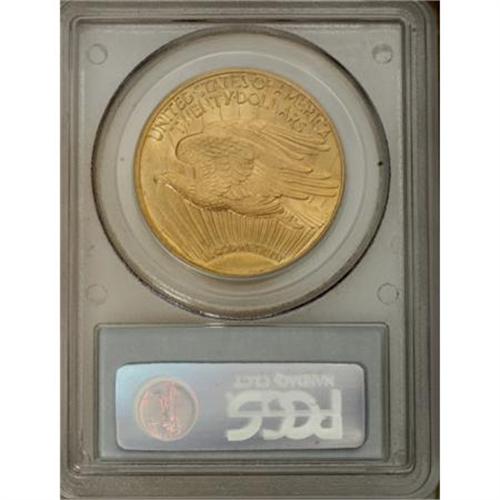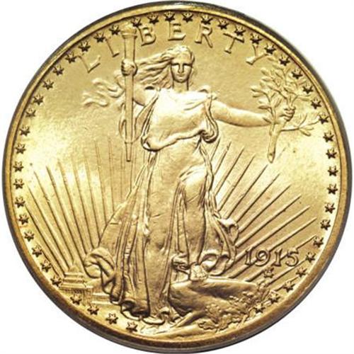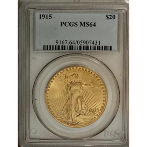 <B>1915 $20 MS64 PCGS.</B></I> MS64 is the highest grade most collectors can hope to acquire, as full Gem pieces are very elusive. This near-Gem specimen exhibits pretty yellow-gold coloration that is imbued with light green. A solid strike emboldens that design elements, including the fingers of both hands, and the eagle's feathers. A few contact marks are visible on each side.<BR><BR><B>Coin Engraver:</B> Augustus Saint-Gaudens<BR><BR><b>Shipping:</b> Coins & Currency (<a target="_blank" href="http://www.heritageauctions.com/common/shipping.php">view shipping information</a>)