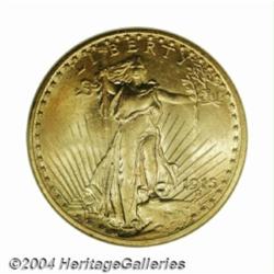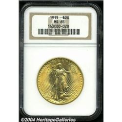 <table><tbody><tr><td><table> <TR><TD width="100%"><TABLE cellSpacing=1 cellPadding=3 width="100%" border=0><TBODY><TR><TD width="100%" bgColor=#79735c><FONT face=arial color=#ffffff size=3><B>Description</B> </FONT></TD></TR><TR><TD width="100%" bgColor=#ffffff><FONT face=arial size=2><B>1915 $20 MS65 NGC.</B></I> Incredibly vibrant for this condition rarity, there are only a few surface marks to keep this remarkable '15-P Saint-Gaudens from an even higher rating. A survivor of an original mintage of just 152,050 pieces, this coin is sharply struck in all but one or two isolated areas. The variegated orange-gold color is quite pleasing, as are the lustrous, satin-textured surfaces. Conditionally scarce, and an issue that is seldom offered at the Gem level. None have been certified above MS65, by either of the major grading services. Population: 16 in 65, 0 finer (12/03).<BR><I>From a Magnificent Collection of Double Eagles.</B></I> </FONT></TD></TR></TBODY></TABLE></TD></TR></TBODY></TABLE><BR><A name=PricesRealized></A><TABLE cellSpacing=0 cellPadding=0 width="100%" bgColor=#000000 border=0><TBODY><TR><TD width="100%"><TABLE cellSpacing=1 cellPadding=3 width="100%" border=0><TBODY><TR><TD width="100%" bgColor=#79735c><A name=PR><FONT face=arial color=#ffffff size=3><B>Previous Prices from Heritage Auctions</B> </FONT></A></TD></TR><TR><TD bgColor=#f6f6ed><TABLE cellSpacing=0 cellPadding=0 width="100%" border=1><TBODY><TR><TD align=middle width="33%"><B>Date</B></TD><TD align=middle width="33%"><B>Service</B></TD><TD align=middle width="33%"><B>Price</B></TD></TR><TR bgColor=whitesmoke><TD width="33%"><B>02/23/2001</B></TD><TD width="33%">PCGS</TD><TD width="33%">$10,350.00</TD></TR><TR bgColor=whitesmoke><TD width="33%"><B>03/04/1995</B></TD><TD width="33%">NGC</TD><TD width="33%">$6,710.00</TD></TR><TR bgColor=whitesmoke><TD width="33%"><B>07/01/1993</B></TD><TD width="33%">PCGS</TD><TD width="33%">$9,625.00</TD></TR></TBODY></TABLE></TD></TR><TR><TD bgColor=#ffffff><FONT face=arial size=1 ?>PLEASE NOTE: All prices realized reflect the final hammer price PLUS the buyer's premium in auctions that charge a buyer's premium. Each item has a notation at the top of the listing indicating whether that lot included a buyer's premium. Example: A item that sells with a final hammer price of $100 and a 20% buyer's premium will display with a price realized of $120. All information listed is intended to be as accurate as possible, but errors are possible. Please use this guide carefully and inform us of any inaccuracies. </FONT></TD></TR></TBODY></TABLE></TD></TR></TBODY></TABLE><BR><TABLE cellSpacing=0 cellPadding=0 width="100%" bgColor=#000000 border=0><TBODY><TR><TD width="100%"><TABLE cellSpacing=1 cellPadding=3 width="100%" border=0><TBODY><TR><TD width="100%" bgColor=#79735c colSpan=6><FONT face=arial color=#ffffff size=3><B>Price Guide*</B> </FONT></TD></TR><TR bgColor=#f6f6ed><TD align=middle><B>Grade</B> </TD><TD align=middle><B>Coin World<BR>(Trends)</B> </TD><TD align=middle><B>Numismedia<BR>Retail</B> </TD><TD align=middle><B>Numismedia<BR>Wholesale</B> </TD><TD align=middle><B>Coin<BR>Universe</B> </TD><TD align=middle><B>Heritage<BR>Value Index</B> </TD></TR><TR bgColor=#ffffff><TD align=middle>64</TD><TD align=right>$6,000.00</TD><TD align=right>---</TD><TD align=right>$2,725.00</TD><TD align=right>$4,100.00</TD><TD align=right>$3,461.75</TD></TR><TR style="FONT-WEIGHT: bold" bgColor=#cccfdd><TD align=middle>65</TD><TD align=right>$25,000.00</TD><TD align=right>---</TD><TD align=right>$11,550.00</TD><TD align=right>$13,500.00</TD><TD align=right>$14,683.33</TD></TR><TR bgColor=#ffffff><TD align=middle>66</TD><TD align=right>---</TD><TD align=right>---</TD><TD align=right>---</TD><TD align=right>---</TD><TD align=right>---</TD></TR><TR bgColor=#ffffff><TD colSpan=6><FONT size=1>*All information listed is intended to be as accurate as possible, but errors are possible. No item may be returned or refused based on this information which is provided as a service to our customers. You should contact each pricing source directly to determine the accuracy of this information. </FONT></TD></TR></TBODY></TABLE></TD></TR></TBODY></TABLE><BR><TABLE cellSpacing=0 cellPadding=0 width="100%" bgColor=#000000 border=0><TBODY><TR><TD width="100%"><TABLE cellSpacing=1 cellPadding=3 width="100%" border=0><TBODY><TR><TD width="100%" bgColor=#79735c><FONT face=arial color=#ffffff size=3><B>Population Guide</B> </FONT></TD></TR><TR bgColor=#ffffff><TD align=middle><!-- Begin Output of Population Grid--><TABLE cellSpacing=0 cellPadding=0 width="100%" border=0><TBODY><TR><TD vAlign=center><TABLE cellSpacing=0 width="100%" border=1 cellsadding="3"><TBODY><TR><TD vAlign=center><TABLE cellSpacing=0 cellPadding=3 width="100%" border=1><TBODY><TR><TD vAlign=center align=middle bgColor=#f0f1e8 colSpan=2 <CENTER><FONT face=Arial size=2><B>PCGS Pop </B></FONT><CENTER></CENTER></TD><TD vAlign=center align=middle bgColor=#f0f1e8 colSpan=2><CENTER><FONT face=Arial size=2><B>NGC Pop</B></CENTER></FONT></TD></TR><TR><TD vAlign=center><FONT face=Arial size=2>(65)</FONT> </TD><TD vAlign=center align=right><FONT face=Arial size=2>18</FONT> </TD><TD vAlign=center><FONT face=Arial size=2>(65)</FONT> </TD><TD vAlign=center align=right><FONT face=Arial size=2>16</FONT> </TD></TR><TR><TD vAlign=center><FONT face=Arial size=2>(>65)</FONT> </TD><TD vAlign=center align=right><FONT face=Arial size=2>0</FONT> </TD><TD vAlign=center><FONT face=Arial size=2>(>65)</FONT> </TD><TD vAlign=center align=right><FONT face=Arial size=2>0</FONT> </TD></TR></TBODY></TABLE></TD></TR></TBODY></TABLE></TD></TR></TBODY></TABLE><!-- End Output of Population Grid--></TD></TR></TBODY></TABLE></TD></TR></TBODY></TABLE><BR><TABLE cellSpacing=0 cellPadding=0 width="100%" bgColor=#000000 border=0><TBODY><TR> <font color='#000000'><span style='background-color: #FFFFFF'><td bgcolor='#FFFFFE'> Important notice: Heritage usually auctions material at the rat