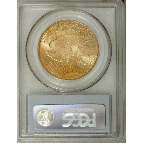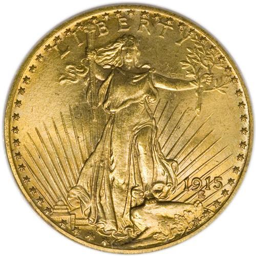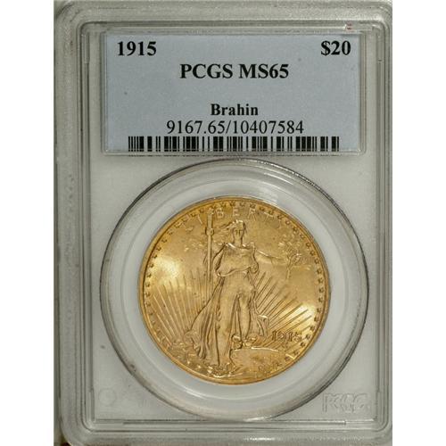 <B>1915 $20 MS65 PCGS.</B></I> Ex: Brahin. Many of the Saint-Gaudens double eagles from the teens turn topsy-turvy the notion that mintmarked issues are scarcer than the P-mint coins, and this issue is one such. As of (4/07) PCGS has certified only 32 pieces of the 1915 in Gem condition, while the 1915-S is among the most common issues in MS65 in the series. This example offers gorgeous sunset-orange surfaces that take on hints of hazel near the rims on each side. The strike is bold, and neither side reveals distractions of any sort. This piece is unimprovable in terms of the present certified population, as neither service has ever certified a finer example.<BR><BR><b>Shipping:</b> Coins & Currency (<a target="_blank" href="http://www.heritageauctions.com/common/shipping.php">view shipping information</a>)