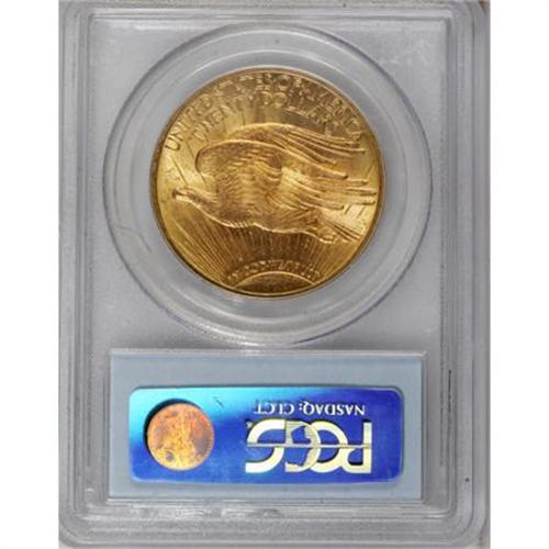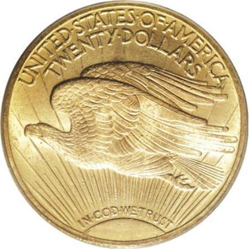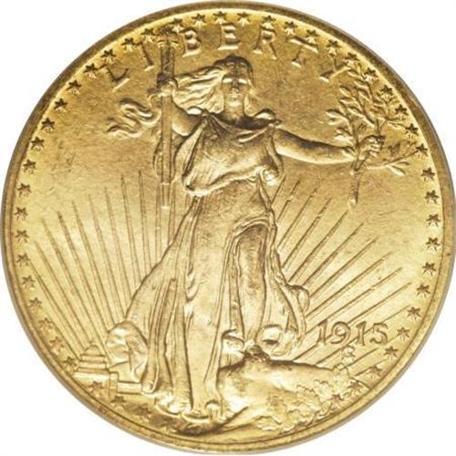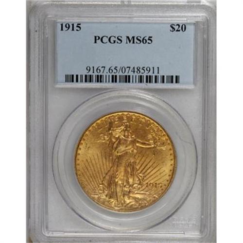 <B>1915 $20 MS65 PCGS.</B></I> The 1915 twenty dollar, with its mintage of 152,000 business strikes, is readily obtainable in grades up through MS64. MS65 coins are a challenge to acquire, as evidenced by just 75 pieces having been graded by PCGS and NGC. Neither service has seen any examples finer.<BR> A delicate mix of variegated peach-gold and mint-green patina covers radiantly lustrous surfaces, and a well executed strike brings out nice detail on the design features. For example, Liberty's fingers and toes are delineated, as are the panes in the Capitol building and the eagle's plumage. A few minute grade-consistent marks are noted. Population: 33 in 65, 0 finer (8/07).<BR><BR><B>Coin Engraver:</B> Augustus Saint-Gaudens<BR><BR><b>Shipping:</b> Coins & Currency (<a target="_blank" href="http://www.heritageauctions.com/common/shipping.php">view shipping information</a>)