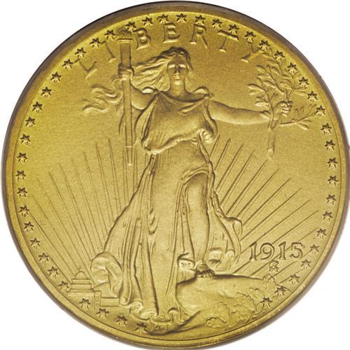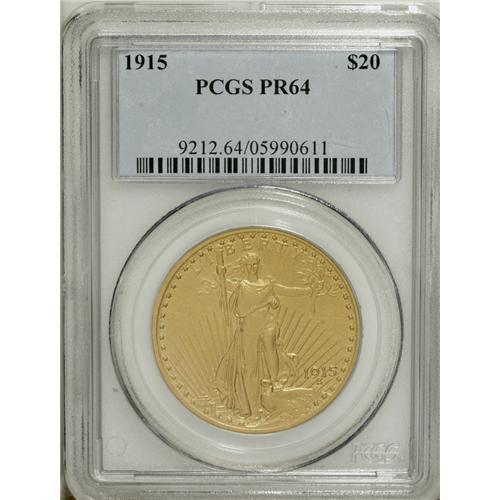 <B>1915 $20 PR64 PCGS.</B></I> Despite a tiny production of just 50 pieces, there doesn't appear to be an appreciable drop-off in the number of proof twenties extant from the previous seven years. Our best estimates places the number of survivors in the vicinity of 30 coins. By 1915 officials at the United States Mint were no doubt keenly aware that the European-inspired matte proofing process had been a dismal failure in the eyes of collectors and the practice was discontinued after this year. This Choice specimen displays the coarse finish and olive-gold color that is characteristic of the issue. There is a pinpoint alloy stain on the left side of Liberty's robe, but even close inspection yields no obvious hairlines or shiny spots. An important opportunity for the 20th century gold specialist. Population: 8 in 64, 1 finer (11/06).<BR><BR><b>Shipping:</b> Coin/Currency (<a target="_blank" href="http://www.heritageauctions.com/common/shipping.php">view shipping information</a>)