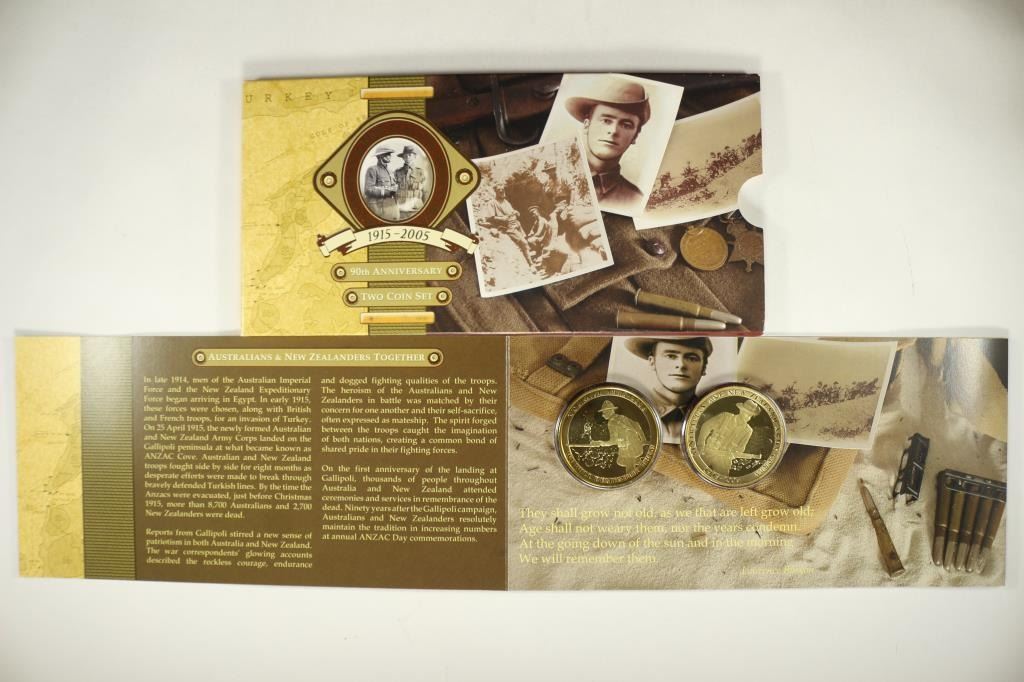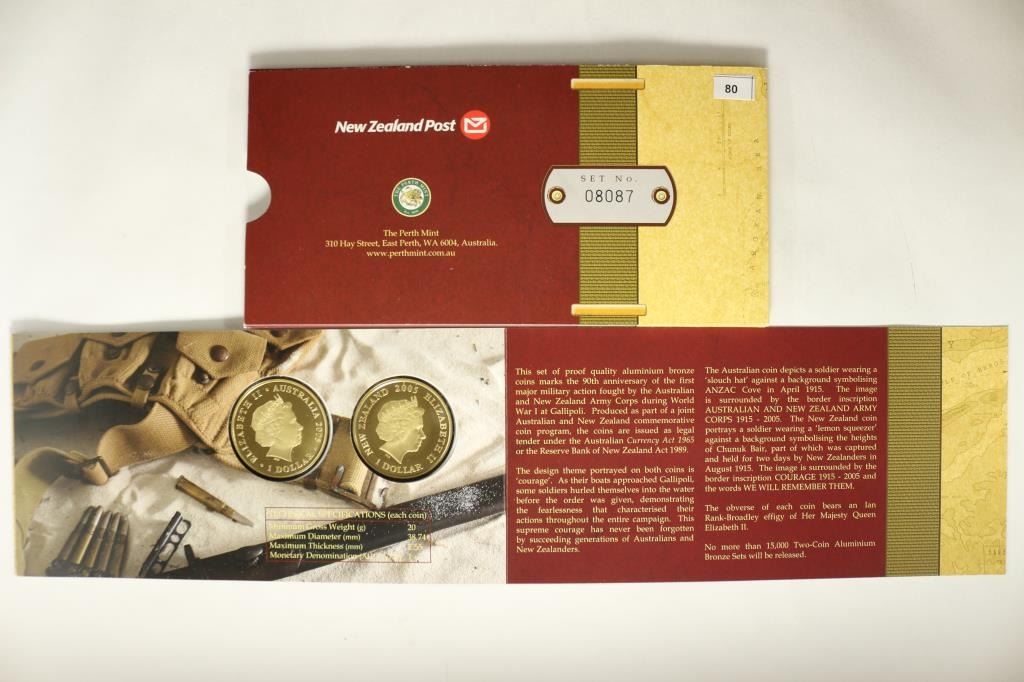 90TH ANNIVERSARY 2 COIN SET, CONTAINS: 1 EACH AUSTRALIA AND NEW ZEALAND DOLLARS, ORIGINAL MINT PACKAGING BY THE PERTH MINT